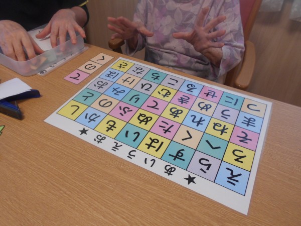合わせカードで楽しんでいます。ひらがな文字を同じカードを置きます。