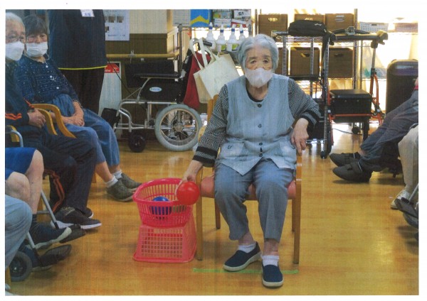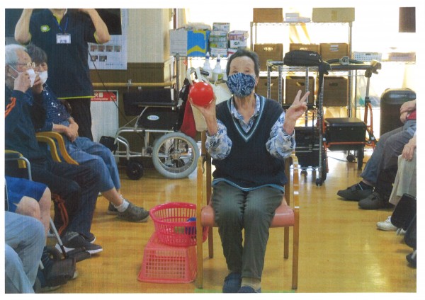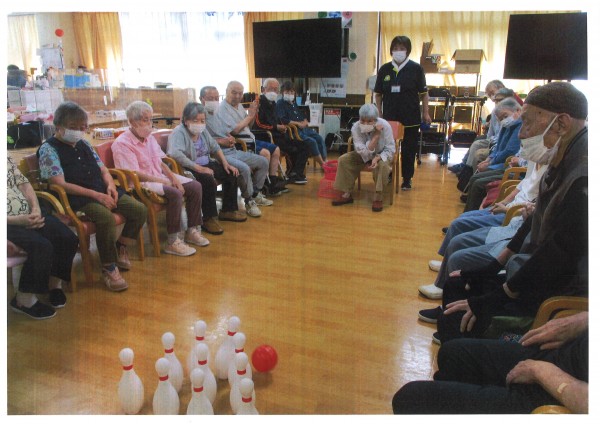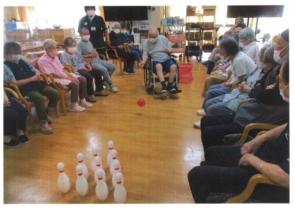 本日午後のレクリエーションは【ボーリングゲーム】です。ストライクを狙う目はとても真剣。ボールが軽くなかなか思うように転がっていかないのですが、それも込みで楽しまれているようです。職員がやってもなかなかスペアも取れない、簡単なようで難しいボーリング、若い頃の思い出が甦るようで様々なエピソードをご披露いただけました♪