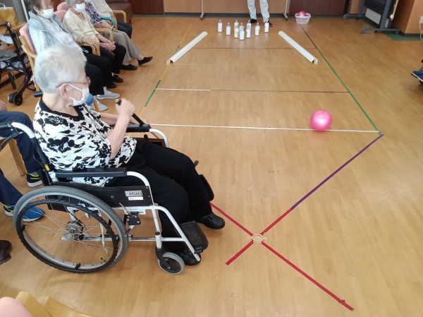 ゴルフのパターで、ボウリングのピンのようなペットボトルを倒すゲームです。