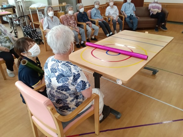 テーブルの上を棒を転がして、どこで止まるかで点数を競うゲームです。