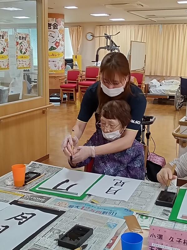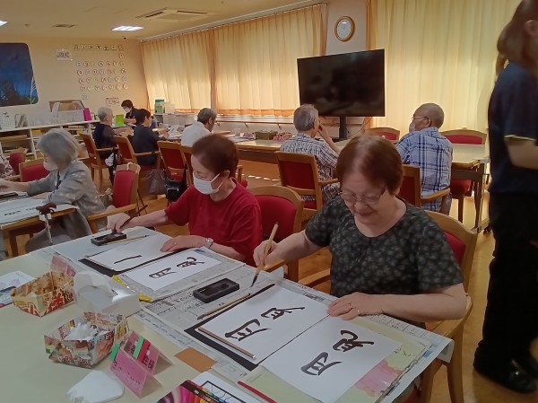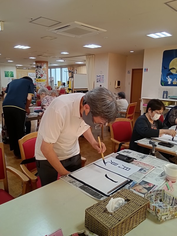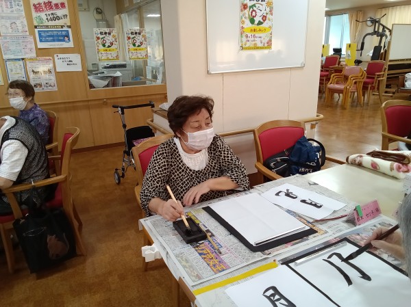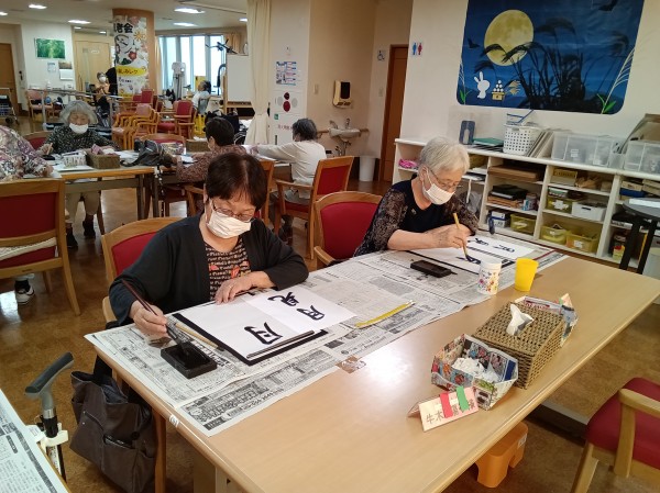中には職員や周りのご利用者様に「どれが良い?」と見てもらっている方もいました(^^♪そして更に中には、納得の行くまで書くため半紙の追加をされている方もいました(笑)!