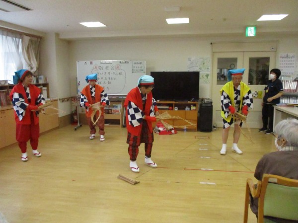 本日は『いきいきサークル 玉すだれ』の方たちに、敬老会第1弾として       おめでたいイベント『南京玉すだれと銭太鼓』を催して頂きました!!!