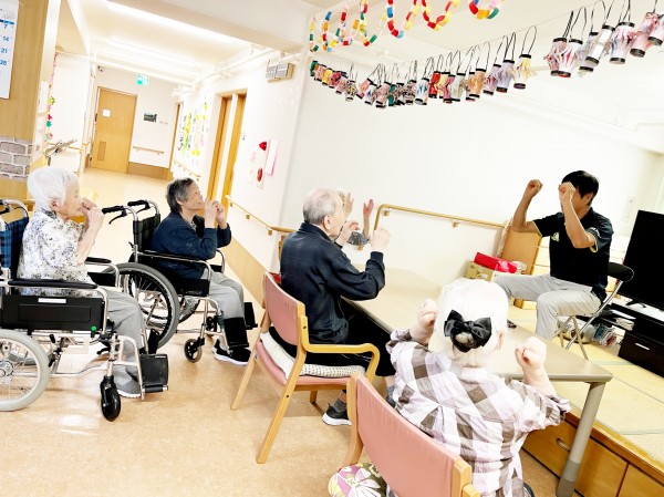 指を使ってじゃんけんや、数え歌、暗算も取り入れてS職員の体操はいつもとっても楽しそうです。I様はじゃんけんが楽しくて、勝つと「やったー!」と、じゃんけんが終わってもまだひとりじゃんけんしておりました。www