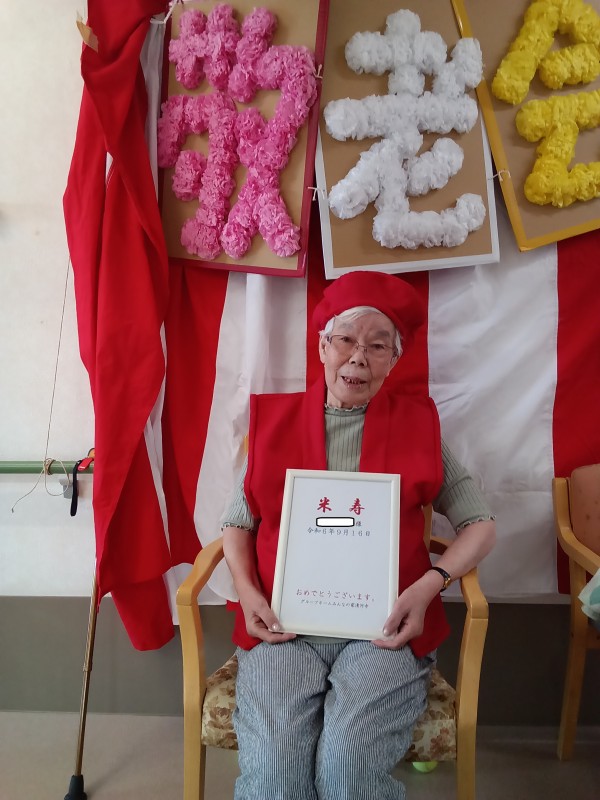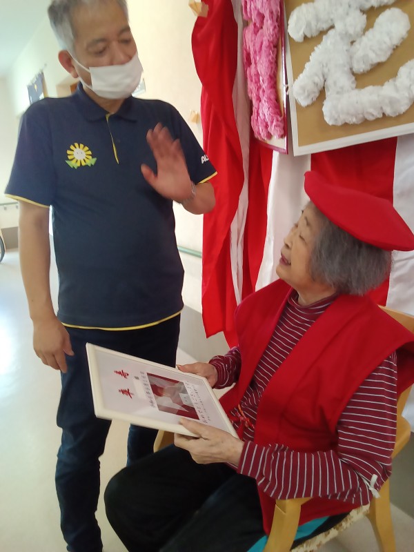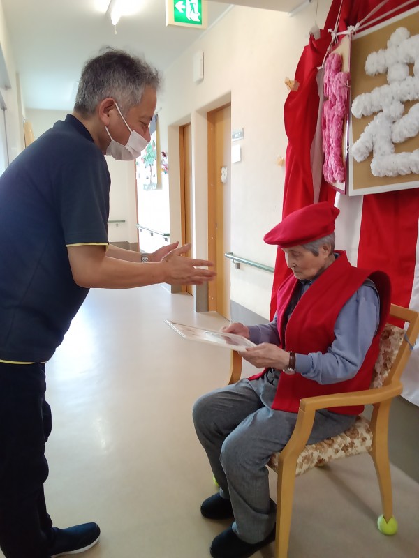赤いちゃんちゃんこ、帽子は、職員のお母様が手作りしてくれたものです。