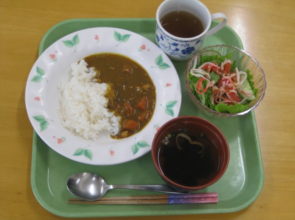茄子・ピーマン・玉ねぎ・人参・ひき肉の具だくさんのカレーに施設で育った野菜のサラダのメニューですね!!