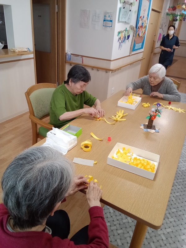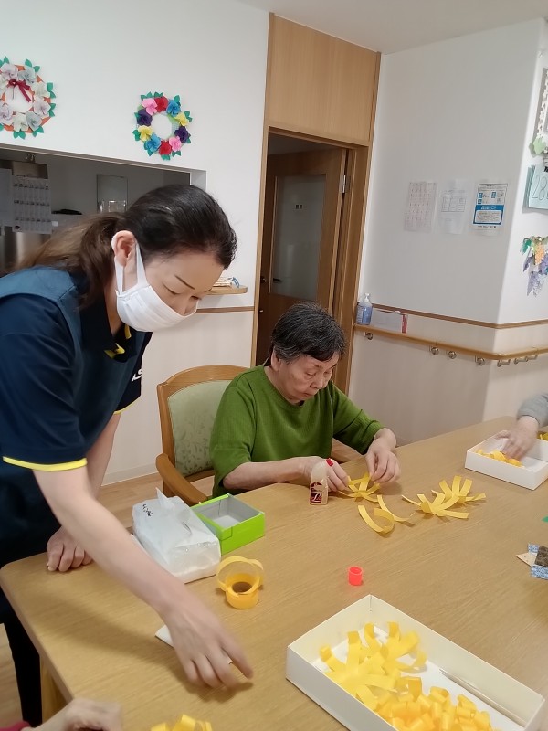 隣の席のご利用者様と塗り絵を楽しまれお互いに「きれいねぇ」と微笑まれ、制作レクでは紙テープで菊の花を丁寧に作成してくださいました(*^^*)