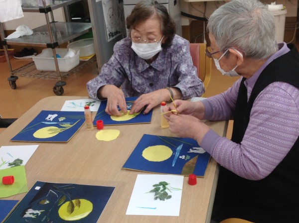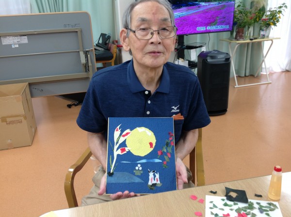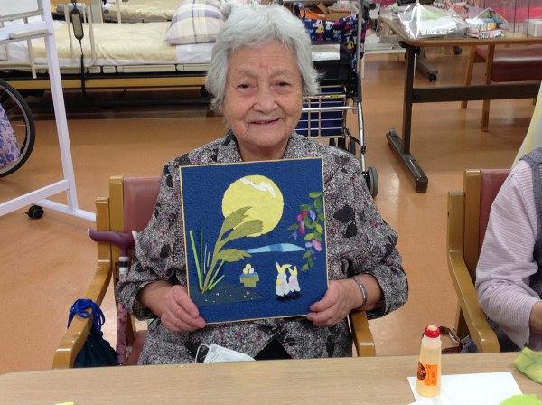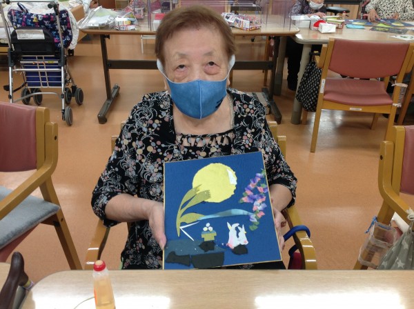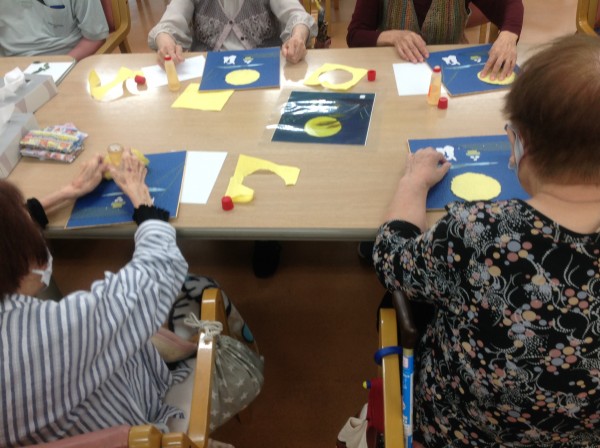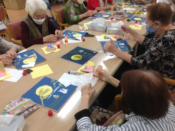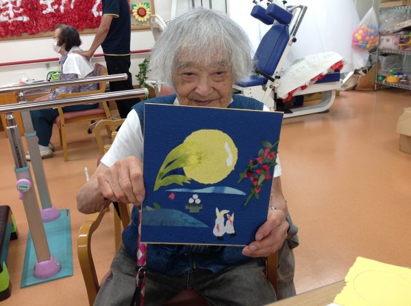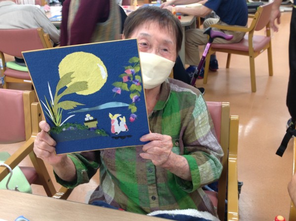 既に過ぎたかと思いますが、月見をイメージしたちぎり絵を作ってきました。そのあと、おやつはとてもおいしい「おはぎ」も用意しました♪