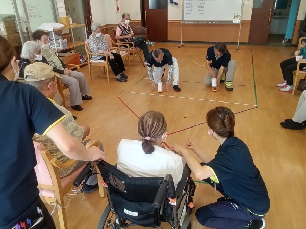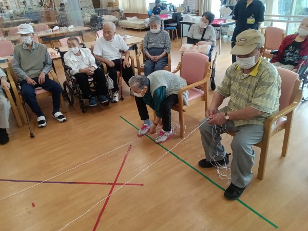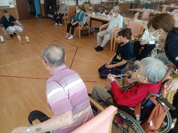 台の上に載せたペットボトルを、ひもを引っ張ってこちら側のゴールを越えるというゲームです。