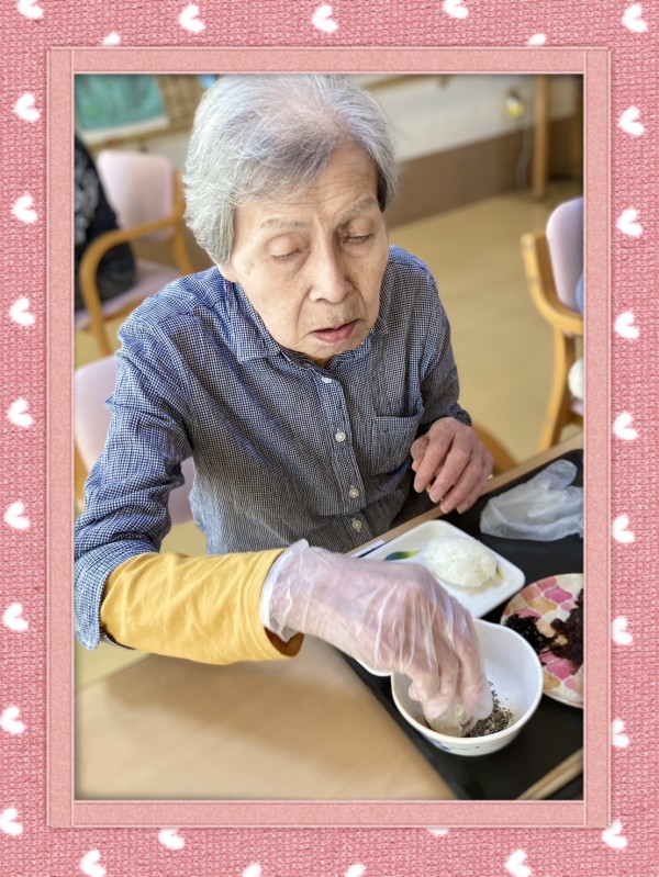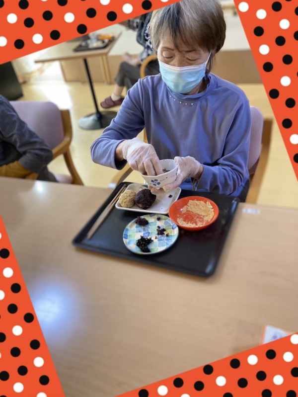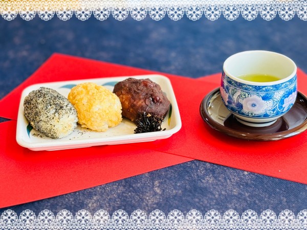 あんこ・きなこ・ごまの三色おはぎをご自身で包んでいただき・・・