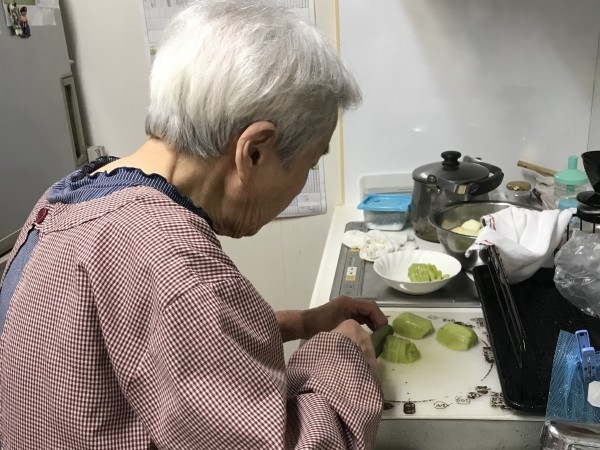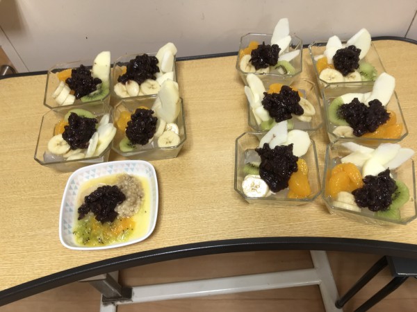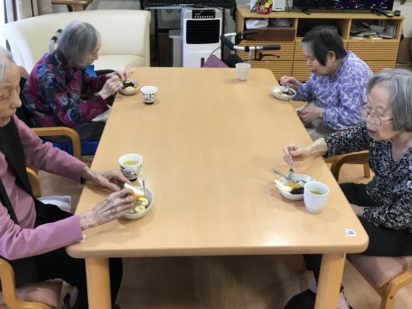 今回のおやつレクは「あんみつ」です♪フルーツの皮むきなどをご利用者様に手伝って頂きました!