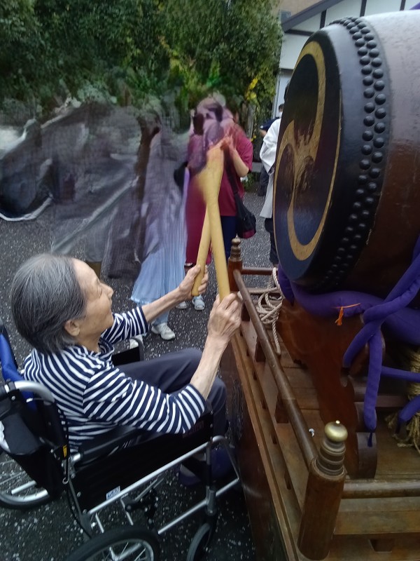 子供会の子供たちが神輿と太鼓を披露してくださり、ご利用者様も太鼓にレッツチャレンジ!!