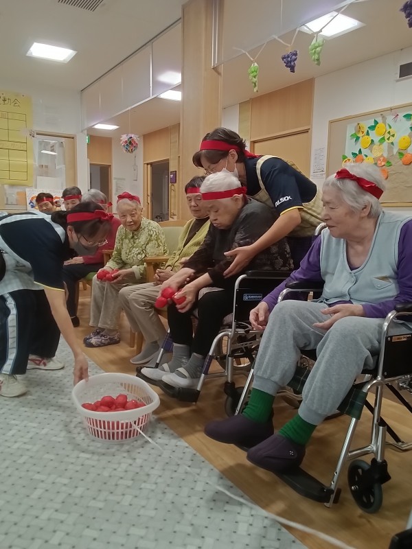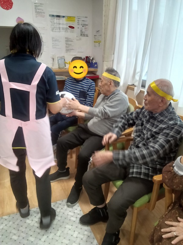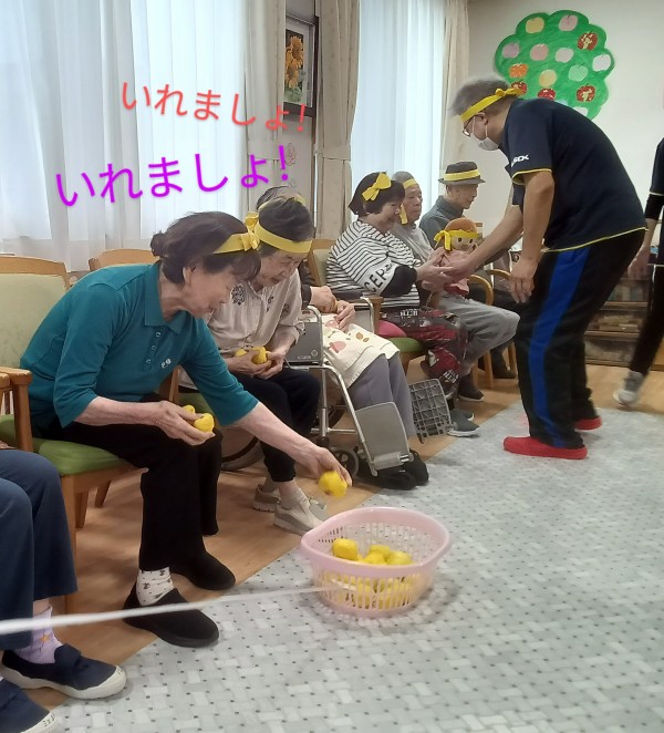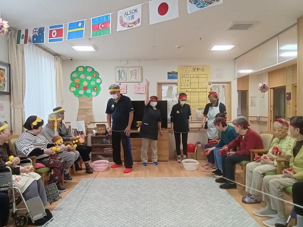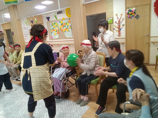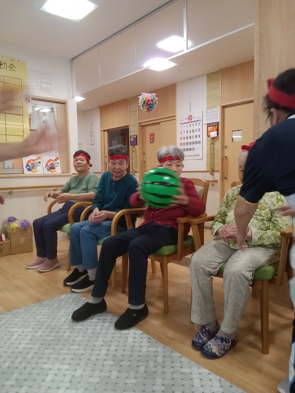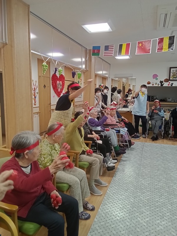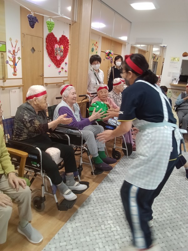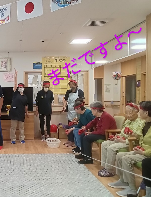 ご利用者様の選手宣誓後いよいよ、ミニ運動会のスタートです♪沢山の種目(玉入れ・ボール送り・マツケンサンバ・リレー・パン食い競争)に皆さんワクワク、ドキドキ????ですね(*^^*)