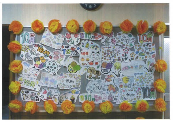 本日は先日皆様に塗っていただいた塗り絵を展示したコーナーをご紹介いたします。毎月季節のテーマに沿った塗り絵を選び、皆様に楽しんで頂いております。皆様の塗る技術も回を追うごとに上達し、色も濃く遠めに見ても目立つようになりました。実りの秋、果物もおいしそうです♪