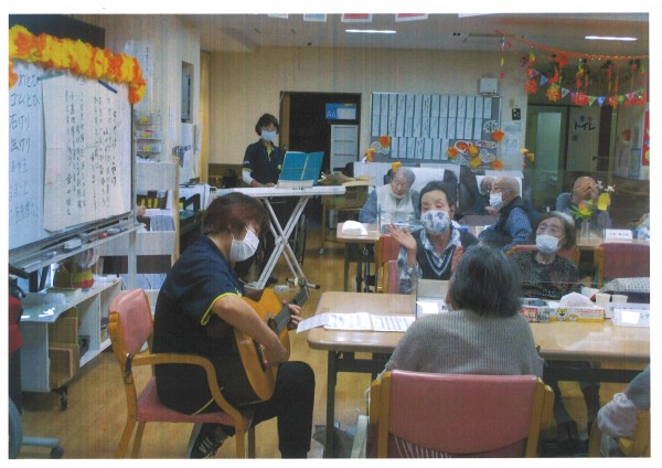 本日午後のレクリエーションは【歌声喫茶・順子】電子ピアノとフォークギターの伴奏で懐かしい曲を歌います。曲にまつわるお話や皆様からのお話をお聞きし対話をしながら演奏を挟みます。音楽は当時の記憶を呼び起こし脳の活性にも役立っているような気がします。本来なら喫茶ですので飲み物とおやつをいただきながら開催していましたが感染予防のためお休みしています。早く以前のように楽しめるといいですね♪