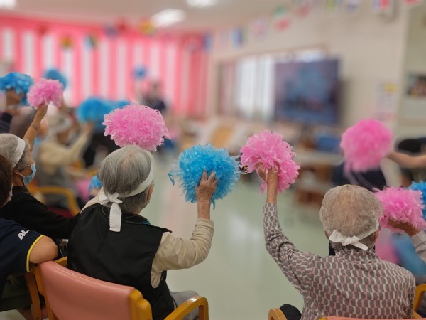 先生の声掛けに合わせて赤(ピンク)上げて!青上げて!