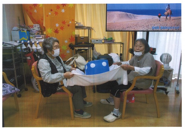 本日午後のレクリエーションは【力を合わせて、タオルでポン!】です。デイサービスでは初めてのレクリエーション。