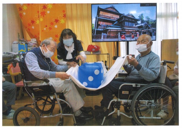 バスタオルをお2人で持ち、乗せたサイコロを飛ばすというゲーム。サイコロの目の合計を競います。息を合わせないとタオルが思うように動かずサイコロが飛びません。タイミングと力加減が必要なこのゲーム、皆様とても楽しそうに取り組まれていらっしゃいました♪