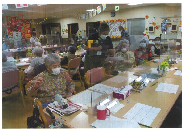 本日午後のレクリエーションは【手作りビンゴゲーム】です。秋と言えば何を思い浮かべますか?と皆様から頂戴した言葉をもとに、ご自分でビンゴカードを作っていただくところから始めるのが手作りビンゴゲームです。紅葉・サンマ・柿・サツマイモ・栗・梨・ブドウ・松茸・名月・ススキ・・秋祭り・運動会等、たくさんの秋を連想するワードが書き出されました。コツは言葉の配置ですが、自由に記入いただきビンゴが始まります。ビンゴ~!と元気な声がホールに響いていました♪