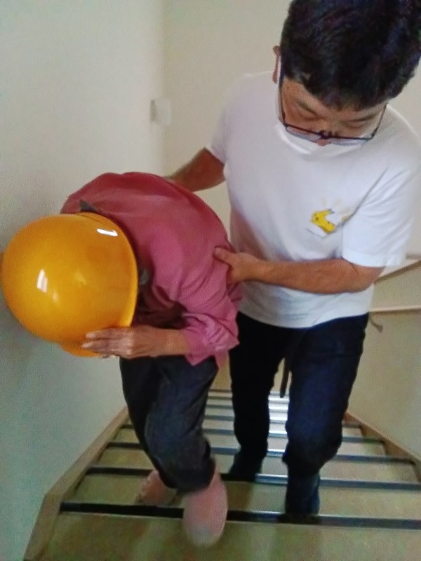 地震想定のため、テーブル下で身を守り、その後2階へ避難していただきました。