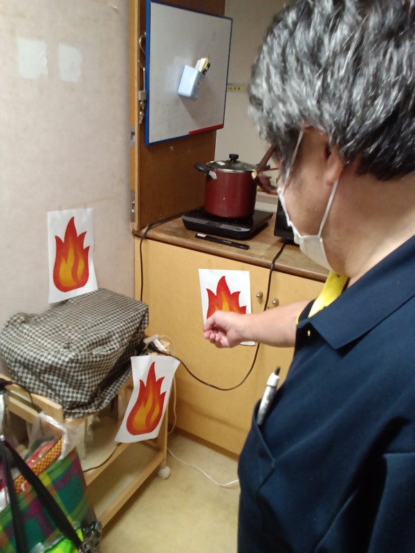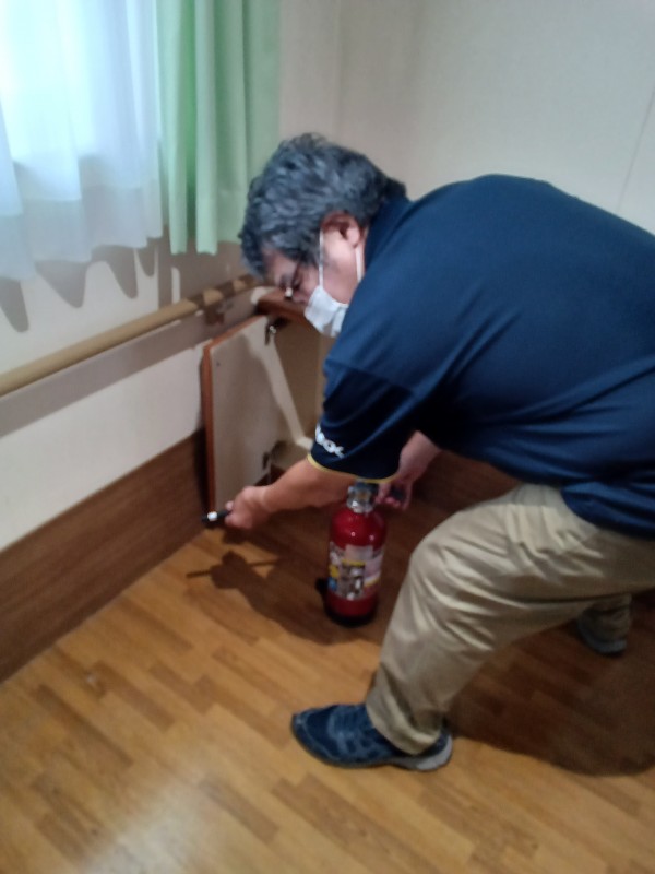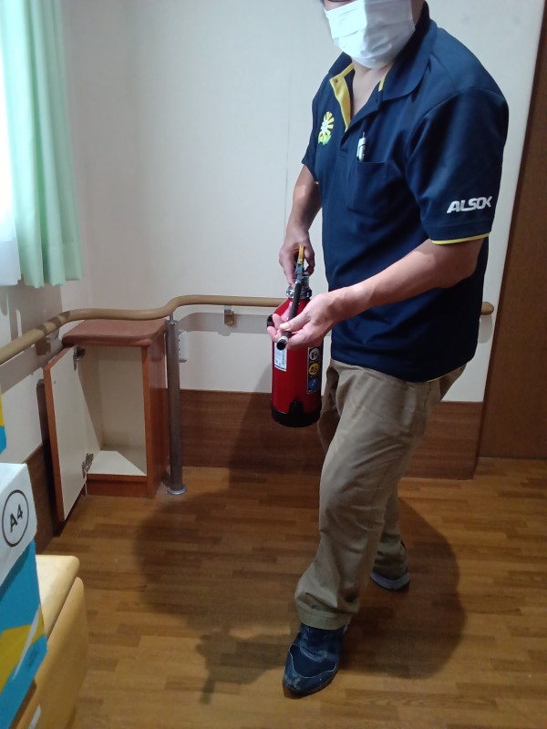 火災を発見し、消火器にて初期消火の訓練、その後消防に通報訓練を行い、各階への避難開始の連絡、入居者の誘導を行いました。