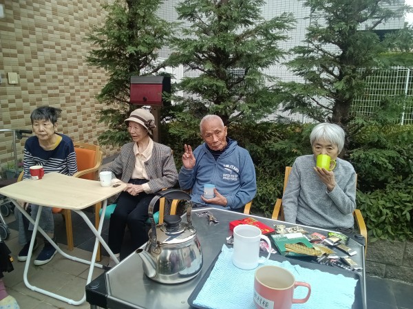 施設の玄関前ではありますが、秋晴れの爽やかな空気の中で飲むお茶はいつもとは一味違う??