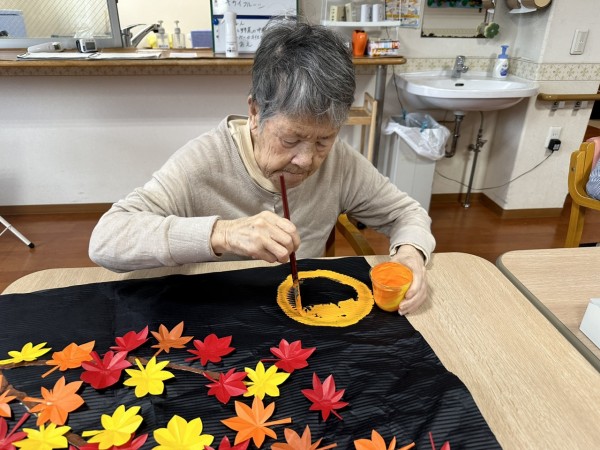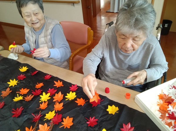 沢山作った色とりどりの紅葉の葉を「きれいな色ねえ!」 「赤色が素敵!」 「もみじ饅頭が食べたくなってきちゃった」と、