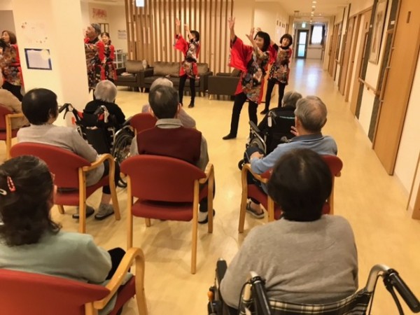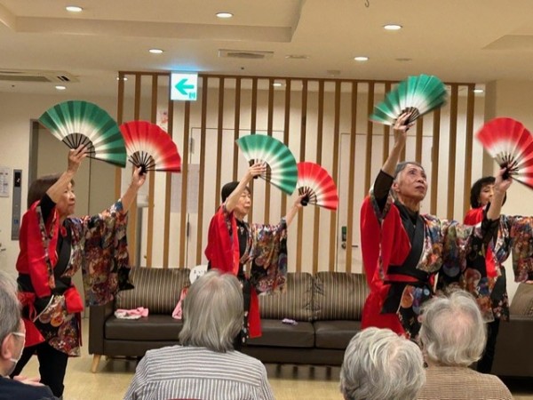 本日は1階のフロアを舞台に見立て、舞踊「舞扇」の皆様にご来設いただき沖縄をはじめ各地域の民謡や懐かしい美空ひばりさんの歌謡曲を舞をご披露下さいました。