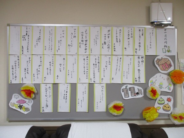 本日午後のレクリエーションは【川柳】です。秋をお題に皆様に川柳を作っていただきました。情景が浮かぶような素晴らしい句がたくさんでき、壁に展示いたしましたので、お楽しみください♪
