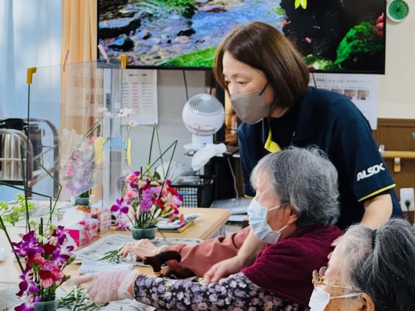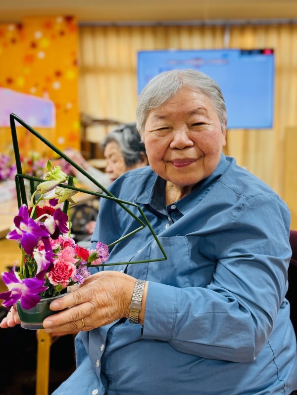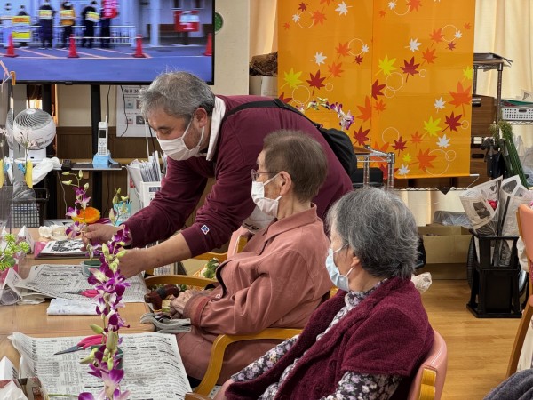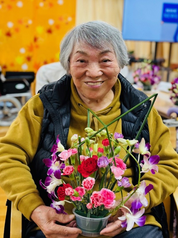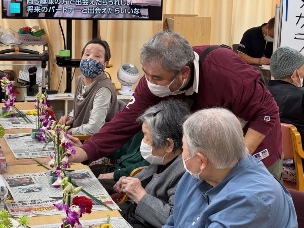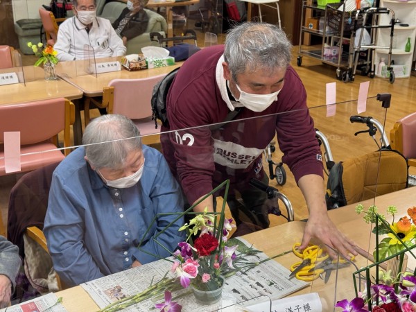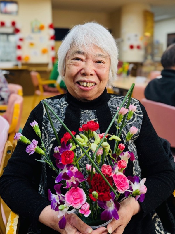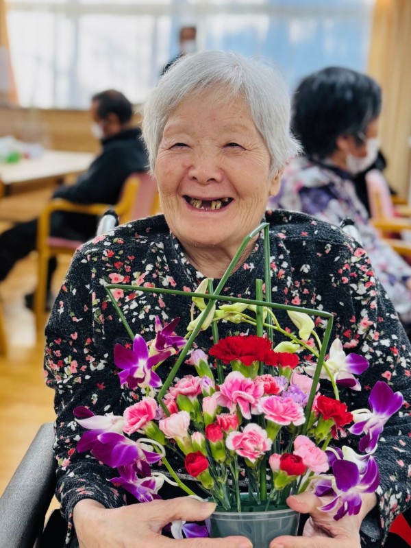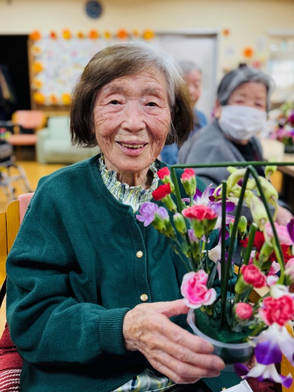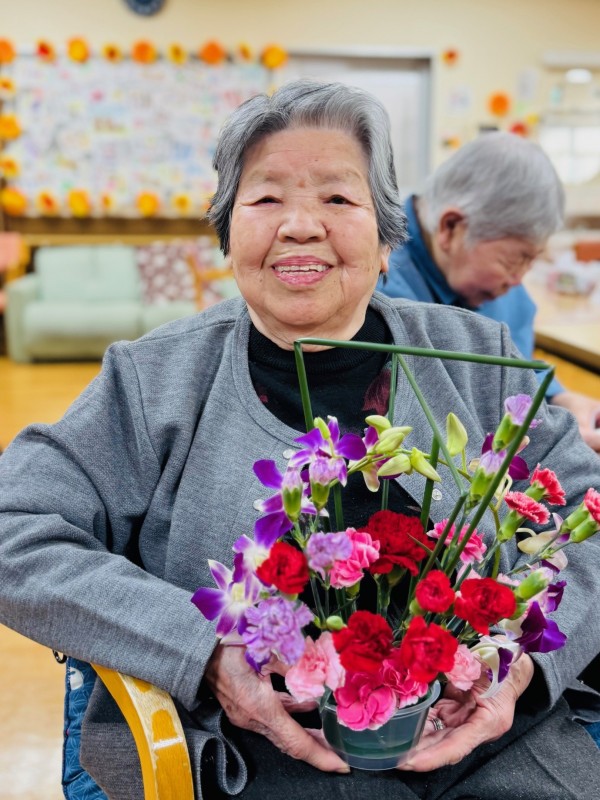 本日午後のレクリエーションは【フラワーアレンジメント教室】毎月大人気のフラワーアレンジメントです。お花が新鮮なので水やりをこまめにすれば、とて長持ちするのも人気の秘訣でしょうか。今回もやさしい先生の丁寧な説明とフォローで素敵なアレンジができました。回を重ねるごとに皆様のスキルも上がってきたと先生が話されていました。うれしいですね♪アレンジメント教室の締めは写真撮影会。ご自分のフラワーアレンジと一緒にパチリ!皆様の笑顔、とても素敵ですね♪
