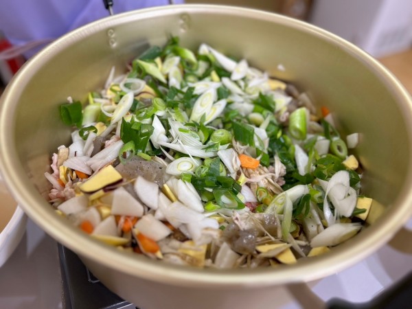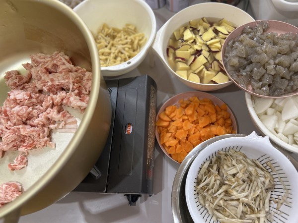 豚汁の材料は、豚肉、さつま芋、蒟蒻、大根、人参、油揚げ、長ネギ、ごぼう