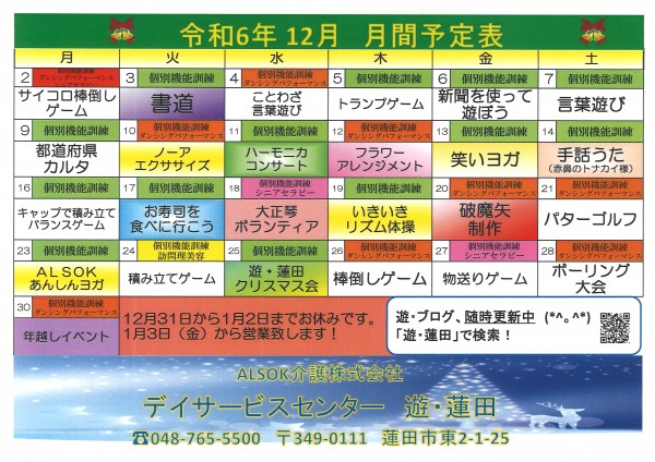 デイサービス遊蓮田の年末営業は12月30日(月曜)までとなります。31日から来年1月2日(木曜)までお休みとさせていただきます