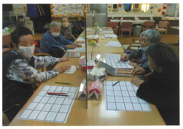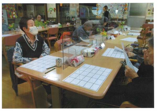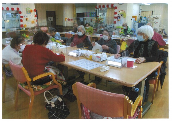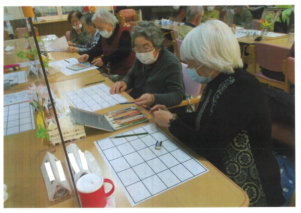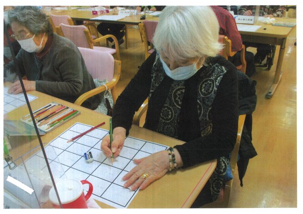 本日午後のレクリエーションは【手作りビンゴゲーム】です。今回は秋に関する言葉を皆様に25個考えていただき、5×5「25」マスのビンゴ用紙をご自分で作っていただきました。いつもは3×3の「9」マスでやっているので苦戦する方もいたのですが、職員もお手伝いして無事ビンゴ用紙が完成しました。そこからは選んでもらった言葉に〇をつけてビンゴになるのを待つのみなのですが、25マスなのでリーチが掛かってもなかなかビンゴにならずヤキモキする場面も。ビンゴ!の声がいつもより大きく、皆様がとても楽しんでいらっしゃると感じました♪