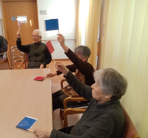 体操で身体を温めたあと、『旗揚げゲーム』を行いました。