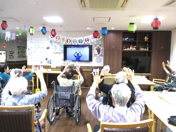 インストラクターと全事業所の入居者様が、リモートで一緒に運動をしています。