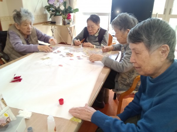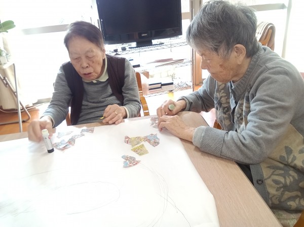 まずは折り紙をちぎっていただこうとお願いすると、「もったいないわよ」などと最初は仰っていましたが、説明すると納得して下さり、皆さん集中してのり付けまで行って下さいました。