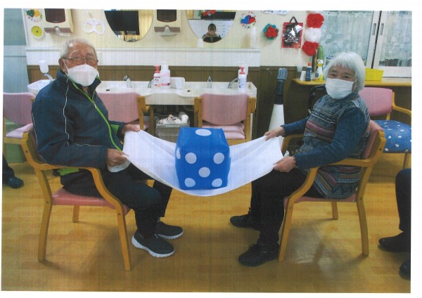 本日午後のレクリエーションは【力を合わせてタオルでポン!】です。