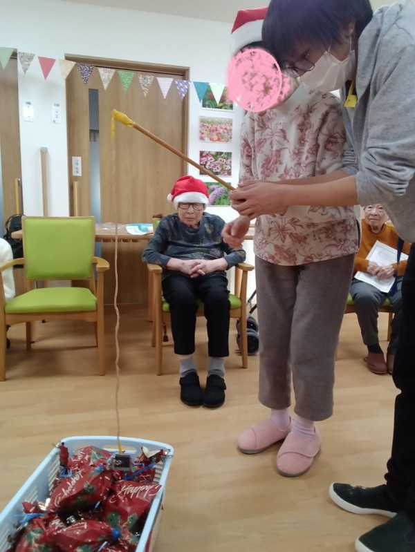 スタッフ、ご利用者様と一緒にケーキ作り。クリスマスソングを合唱、お菓子釣り。