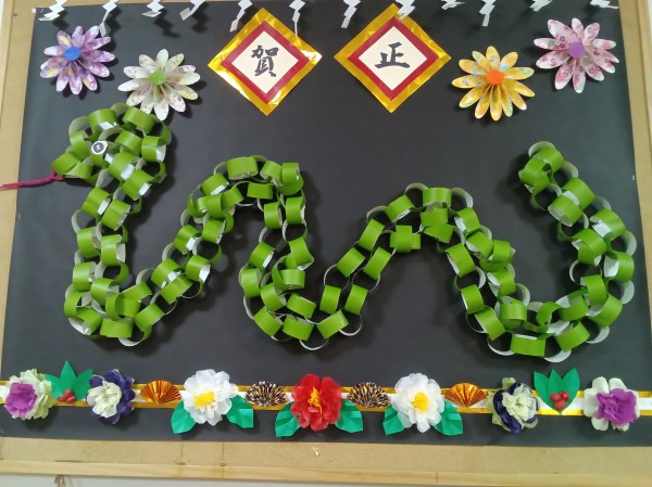 大きなへびときれいな花の壁飾りが出来上がっていました❣