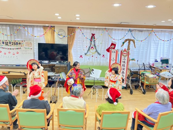 12月25日クリスマス当日は、昼食にセンター長特製照り焼きチキンをご用意し、午後は三味線演奏会となりました〜????♪