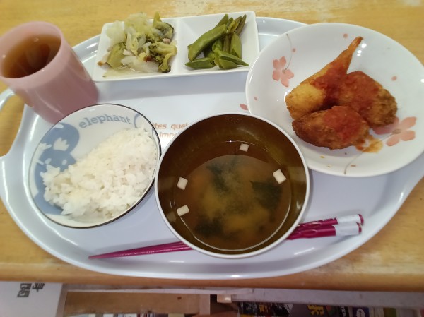 エビフライ????/クリーミーコロッケ/トマトソース/スナップえんどう/野菜とベーコンの炒め物