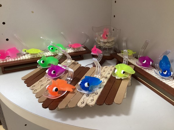 金魚さんたちが載せられているのは、プラスティックのスプーンやあずきバーの棒、ペットボトルの底の部分です。