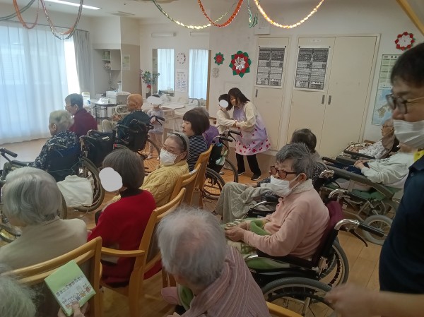 利用者様と園児たちと手をつないだり、プレゼント交換したり、