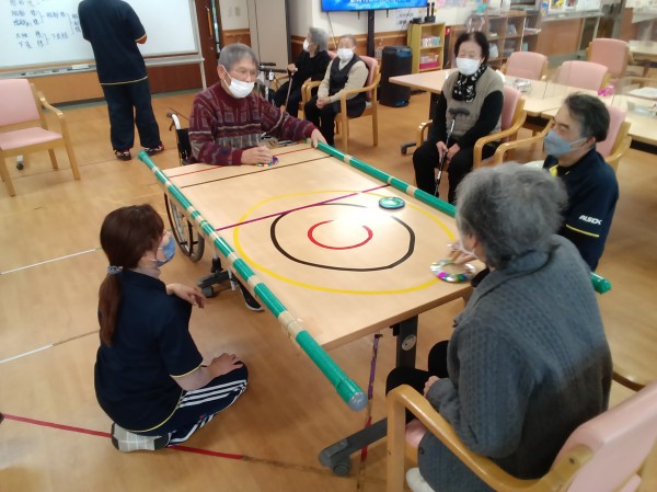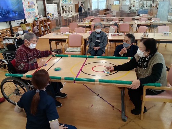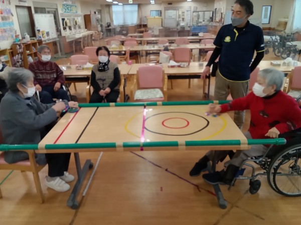 テーブルに座って、ホッケーのパックを相手側に落とすゲームでした。