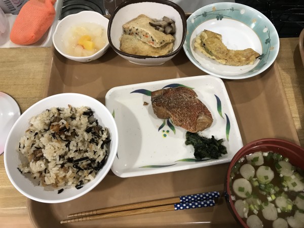 メニューは、「ひじきご飯」「赤魚の煮付け」「かぼちゃの天ぷら」「炊き合わせ」「フルーツの缶詰」「ほうれん草のお浸し」「お麩の味噌汁」です♪特別食かと思ったのですが、通常のメニューだったみたいです♪