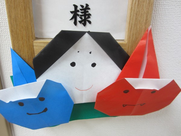 さまざまな色の折り紙で鬼と福を作成しました\(^o^)