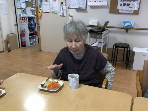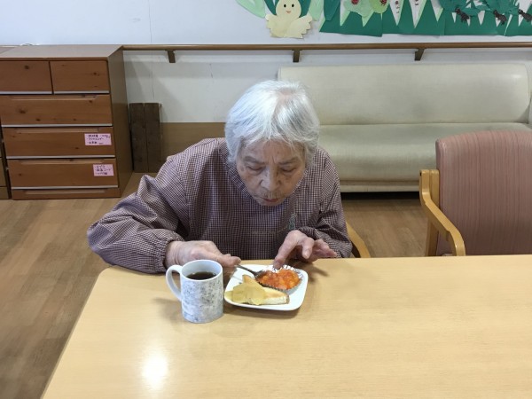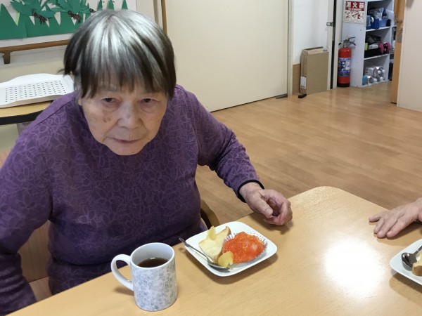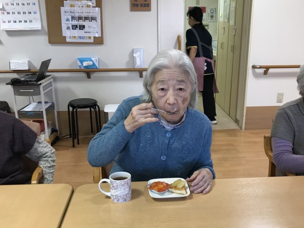 最近では、トーストにリンゴを煮たものを乗せて、フルーツ缶を使ったゼリーとともにお出ししたり、焼きおにぎりを作って召し上がりました♪