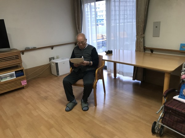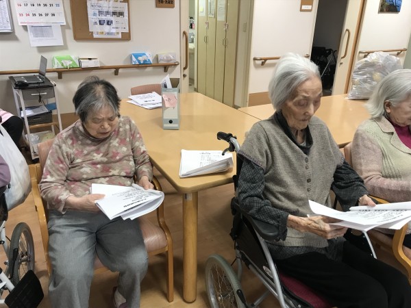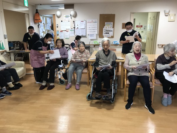 節分の日、鬼退治の後に歌会を行いました♪歌の本をお渡しして、季節の唱歌や童謡をたくさん皆さんで歌いました♪タンバリンも用意してとても盛り上がりましたね♪