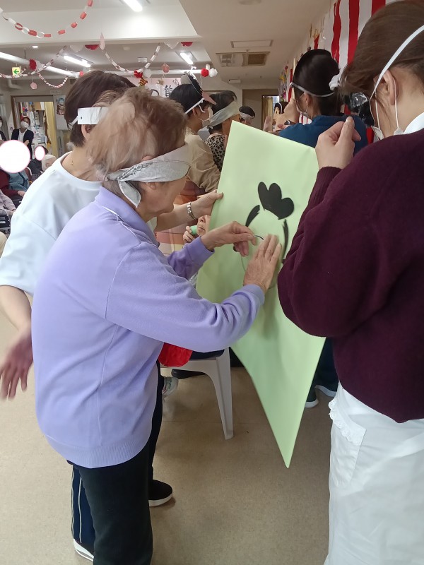 福笑いでは3名の方に前に出て頂きました!「わー、おかしい顔になっちゃった」「なかなか難しいね」と仰り、楽しまれたご様子です(^^)/