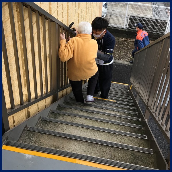 今回初めて“外階段”を使って避難誘導を行いました。(自立歩行者のみ)
