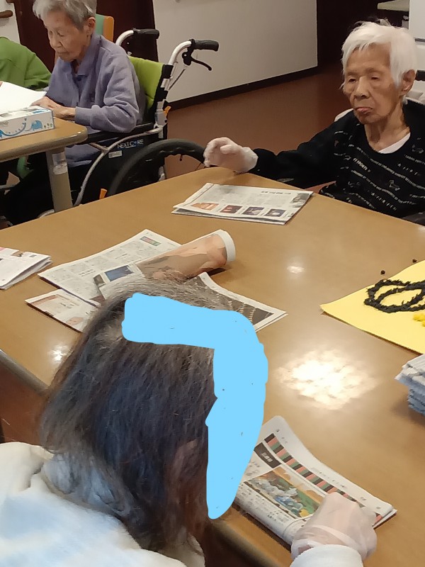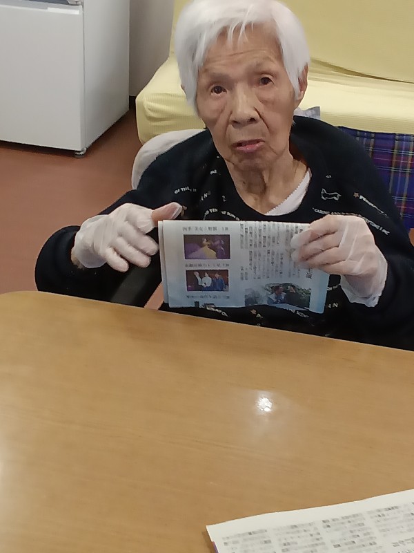 入居者様に新聞紙を1枚づつまとめるお手伝いをしてくださっています